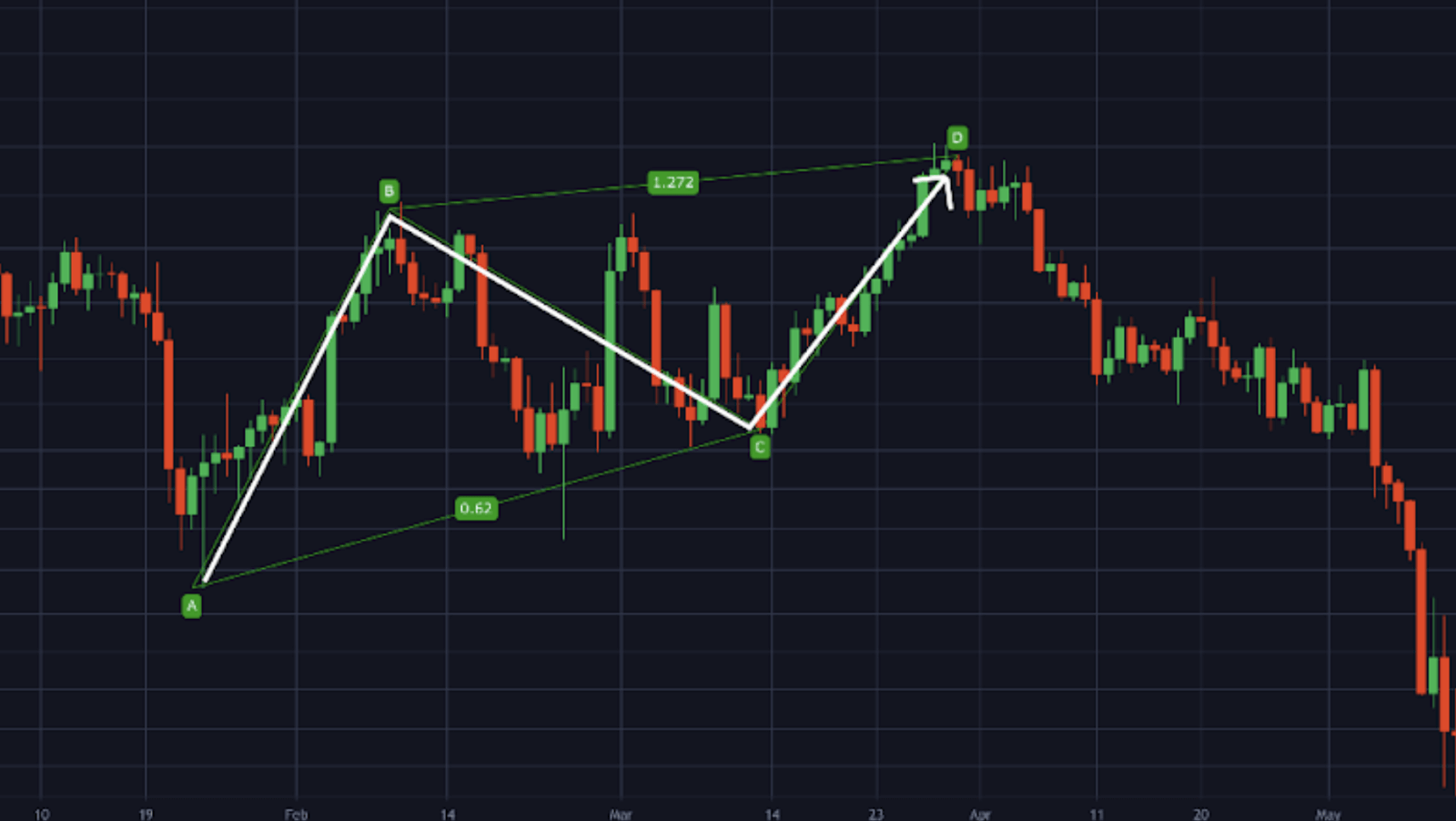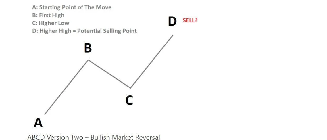 To identify the bearish ABCD pattern trading, check the starting point. It moves from point A, which is usually at the lowest position. Then it rises a bit to point B marking the first high point on the graph. From that point, it comes down to point C, the low level, and finally rises to point D, the highest point where traders must sell.