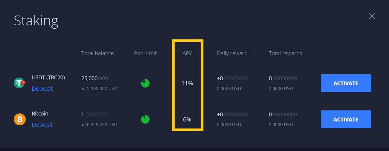 APY, or annual percentage yield, is much like APR, except that it takes into account the effect of compounding interest. This means that acquired interest rates contribute to the calculation of the next interest rate, which will inevitably generate a higher amount of interest than APR. This is similar to the concept of compound interest in traditional finance.