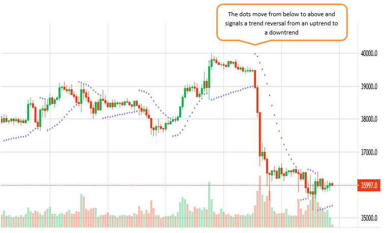From the image below, the dots flipped from below the candles at around $39,500 on the BTC chart to signal a trend reversal.