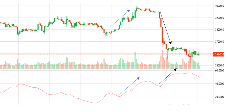 Each of the ADX increases above 40 corresponds to a strong trend. An increase from 20 to about 45 corresponds to a price increase from $37,600 to $40,000.