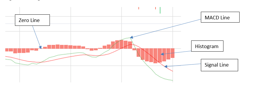 The MACD comprises four components: the MACD zero line, the MACD line (green), the MACD signal line (red), and the MACD histogram as shown below. When the signal line and the MACD line converge or diverge, they give a signal to the trader to either sell or buy. When the MACD line slopes downwards and crosses the signal line, it gives a bearish signal thus a good time to SELL. Likewise, when the MACD line slopes upwards and crosses the signal line, it gives a bullish signal thus a good time to BUY.