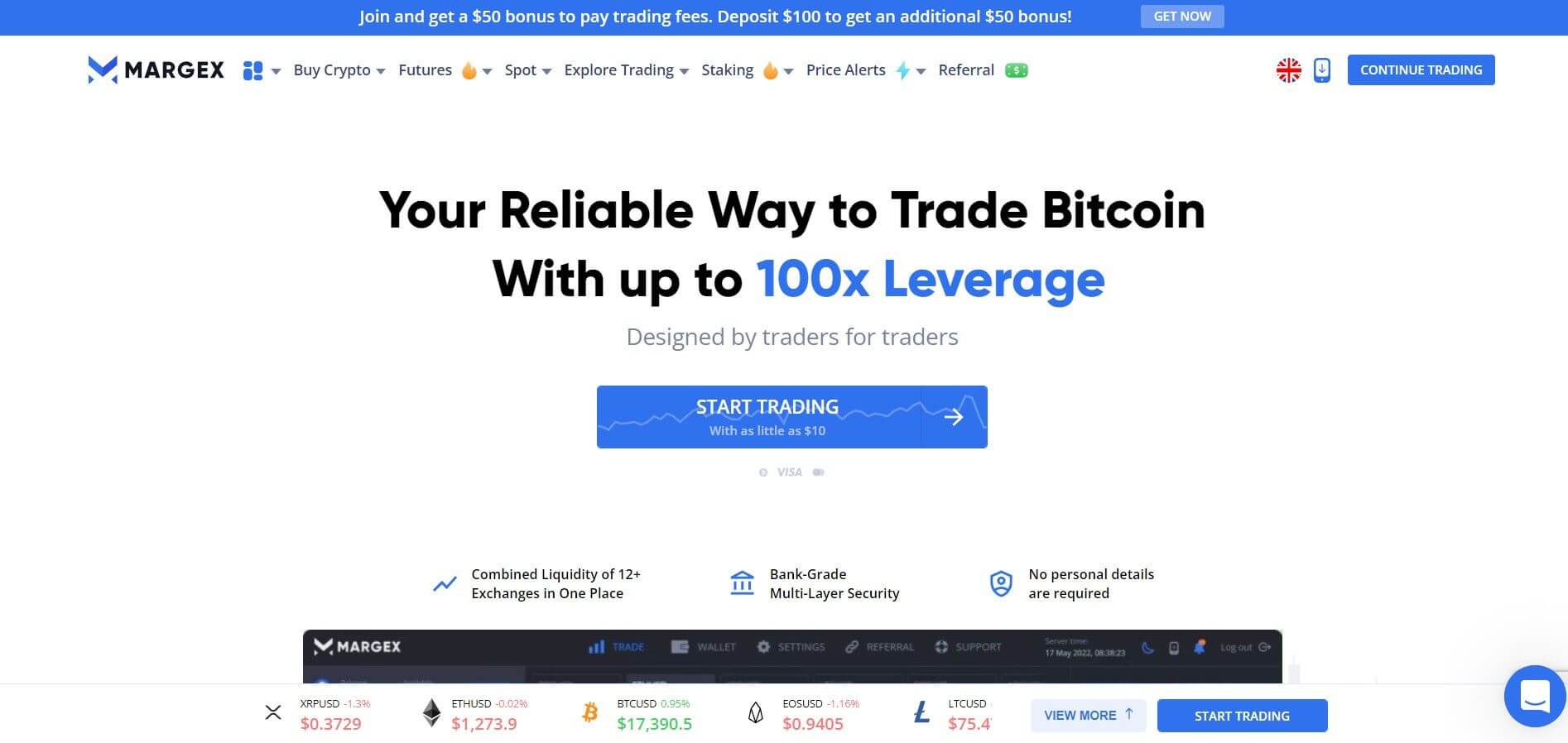 - Margex also allows users to leverage trade positions up to 100x of their initial stake.