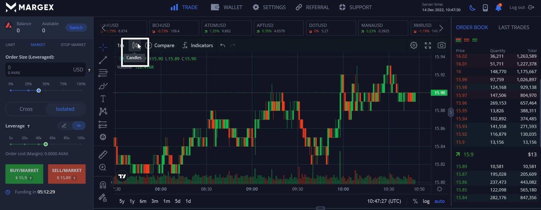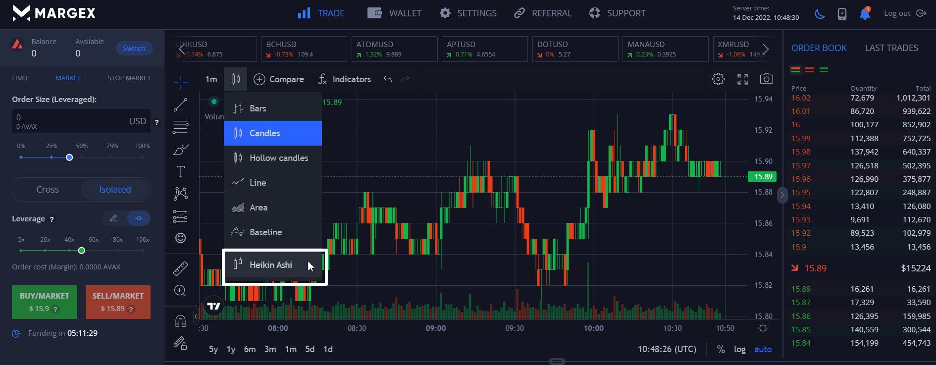 Moreover, all crypto assets on Margex, including BTC, USDT, USDC, DAI, ETH, Link, wBTC, and USDP, can be used as trading collaterals. You can start trading on Margex with Heikin achi candles and other indicators, as shown below. All you need is the Margex responsive and well-equipped mobile app.