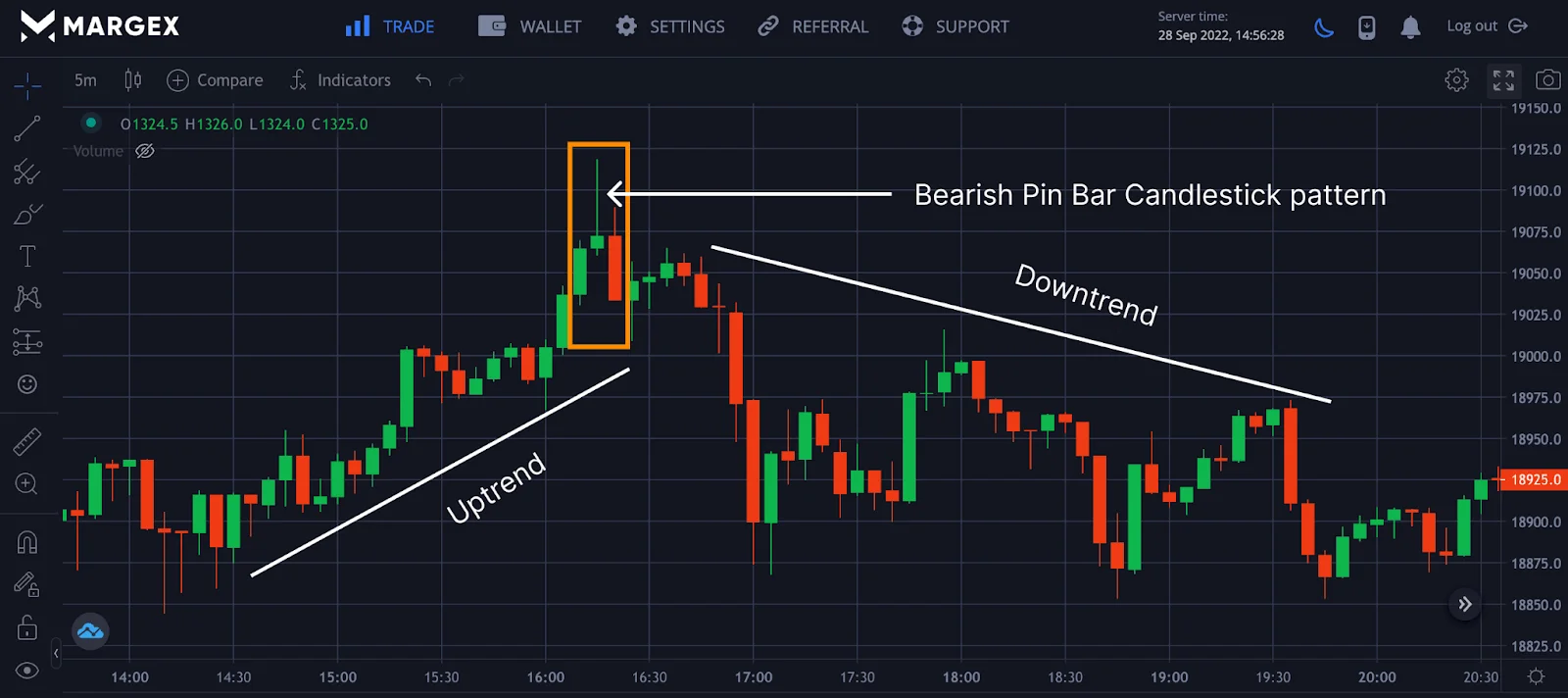 Another type of pin bar candle pattern is the shooting star bearish candle with a long, small body and little or no upper wick. This appears at the end of a trend to signal the end of the bullish run, as the price could be heading bearish in a short time.