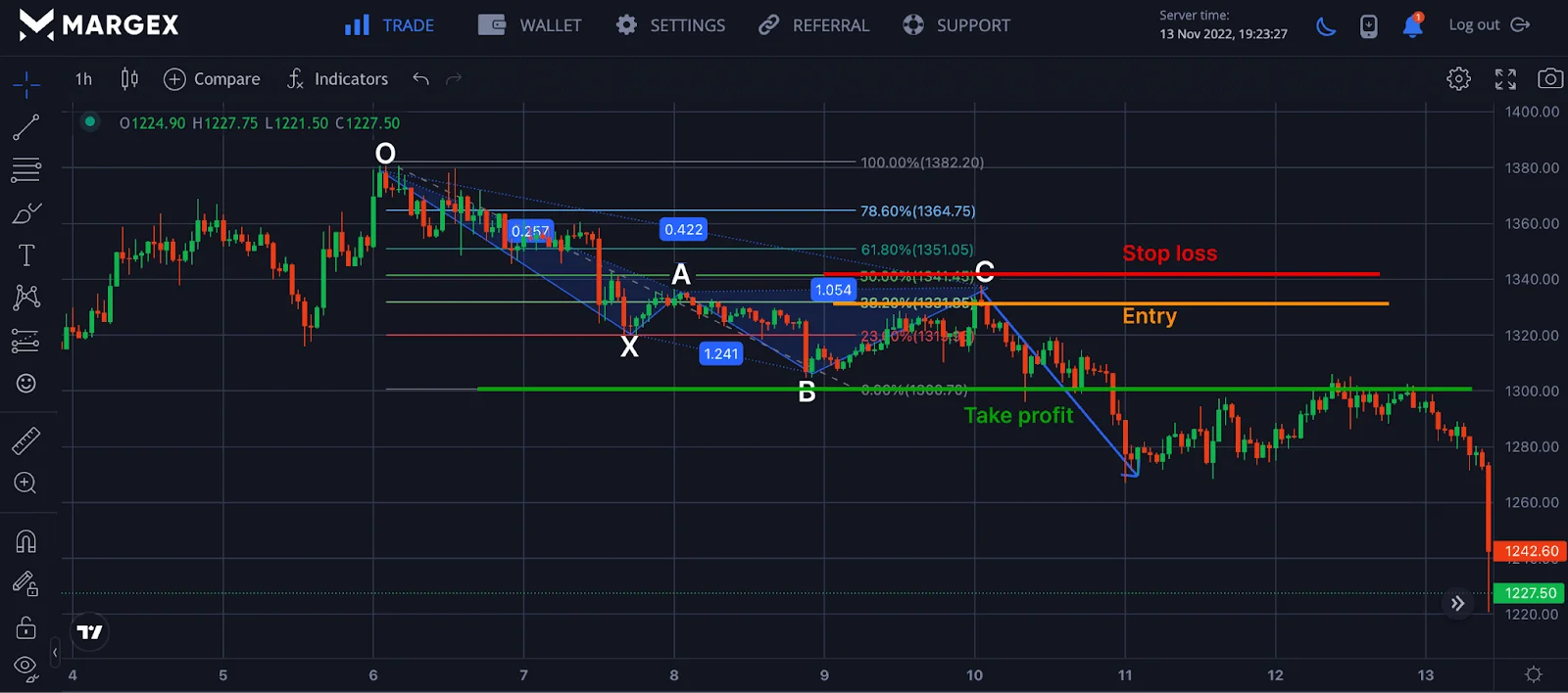 You don’t need to draw the shark pattern manually, as this would require a lot of time and effort to calculate the Fibonacci ratio and points; you can use this tool freely on the Margex platform to carry out all your technical analysis strategies.