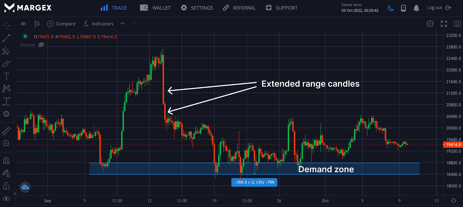 The extended range candles (ERCs) area includes a zone where candles with little or no wicks are dominant, and prices tend to fall or rise the most due to price volatility before a base is formed. ERCs, tell the trader the trend reversal could be getting to the base formation, which will detect the next price movement. During price ranges at the base, sellers and buyers are locked in price as they try to determine the next price movement.