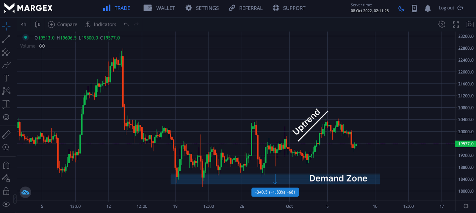 From the chart above, the price of the BTCUSD pair formed a demand zone at around $18,400 with more buyers willing to buy at this range leading to price reversal whenever it touches this range.
