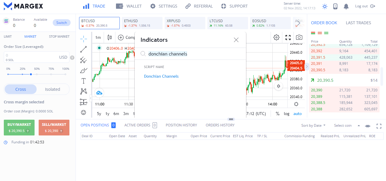 After doing that, go to indicators and search for Donchian channels. This is one of the best indicators for the Turtle strategy.