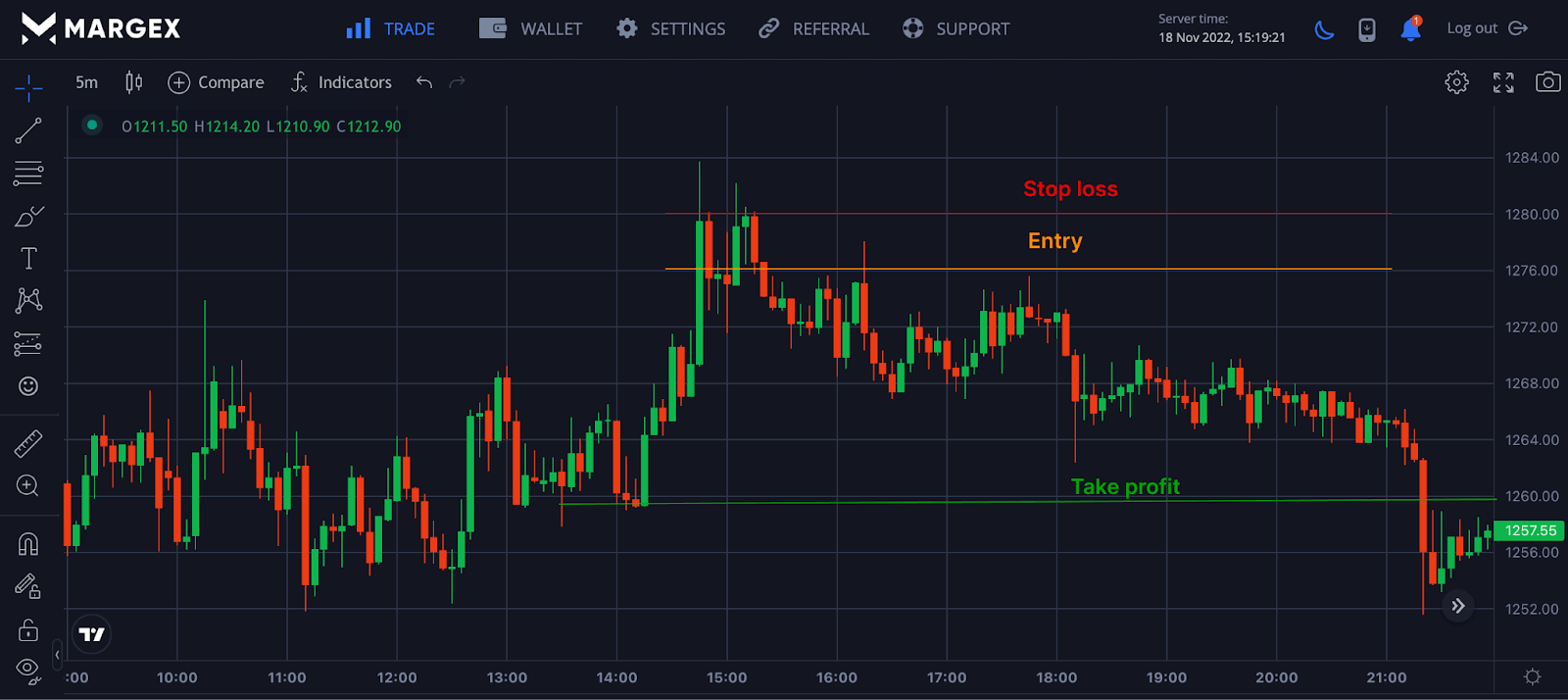 After identifying that the hanging man candle has been formed with a clear confirmation as to the market’s next direction, a trader would need to identify the entry position for a potential short entry. An entry point is taken as the price direction favors the candle pattern.
