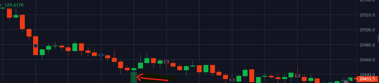 A long wick candlestick can be seen in the image below following a downturn in which the price decreased from roughly $20,482.5 to around $20,429.50. A long wick candlestick appears here as a possible bullish reversal signal, indicating that the asset is making a bottom, which a price gain may follow. The extended (long) wick underneath the candle body indicates sellers attempted to lower the price dramatically, but purchasers managed to drive it back up. Buyers demonstrated overpowering purchasing prowess, continuing over and leading to a price hike. In this case, the asset’s price soared to roughly $20,470 following the emergence of the long wick candlestick.
