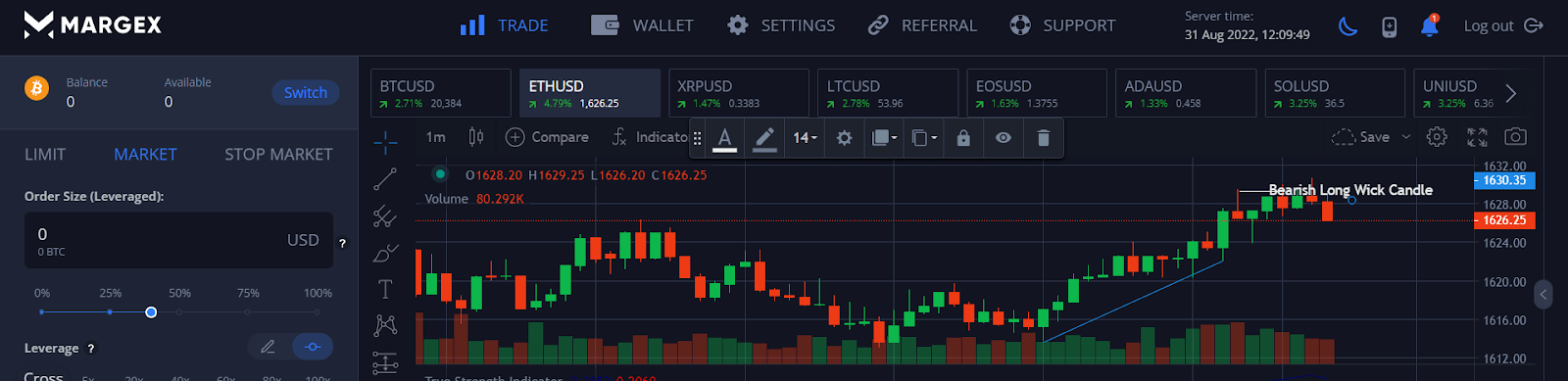 An illustration of the long wick candlestick pattern from the Margex trading platform
