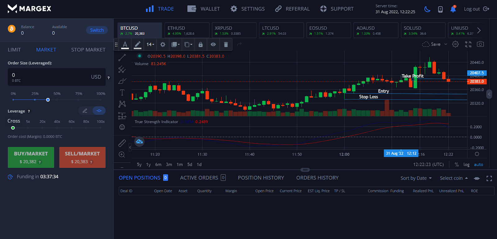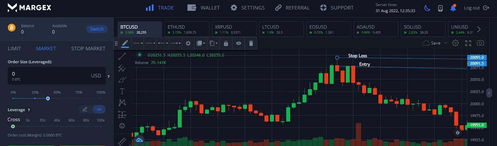 - The trader places a Take Profit order. Because this uptrend is reverting into a negative trend, traders should place a Take Profit order around the support level. The support level in this situation is about $19,942.