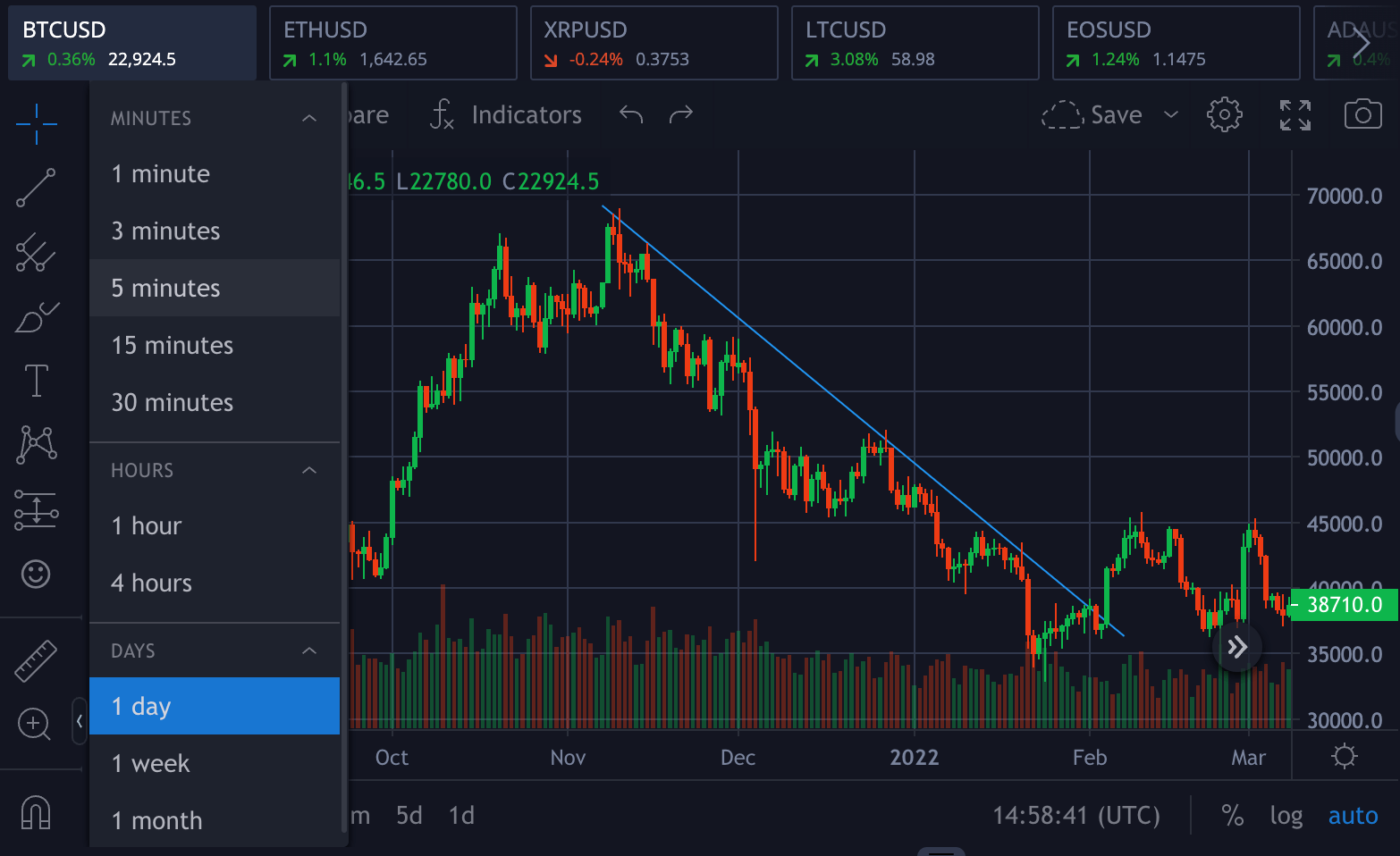 3. Candlestick – By clicking on the candles icon, you can switch from a line chart to a candle chart or vice versa.