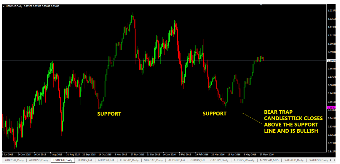 This chart features a bullish bear trap candlestick that breaks the support level and goes down but eventually closes above the support line forming a bullish candlestick.