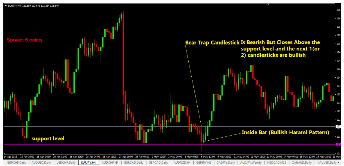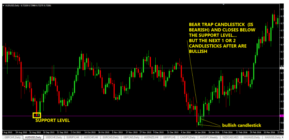 This chart features a bearish bear trap candlestick that breaks and closes below a support price level. Note that the next one or two candlesticks after the breakout can be bullish reversal candlesticks or display bullish momentum.