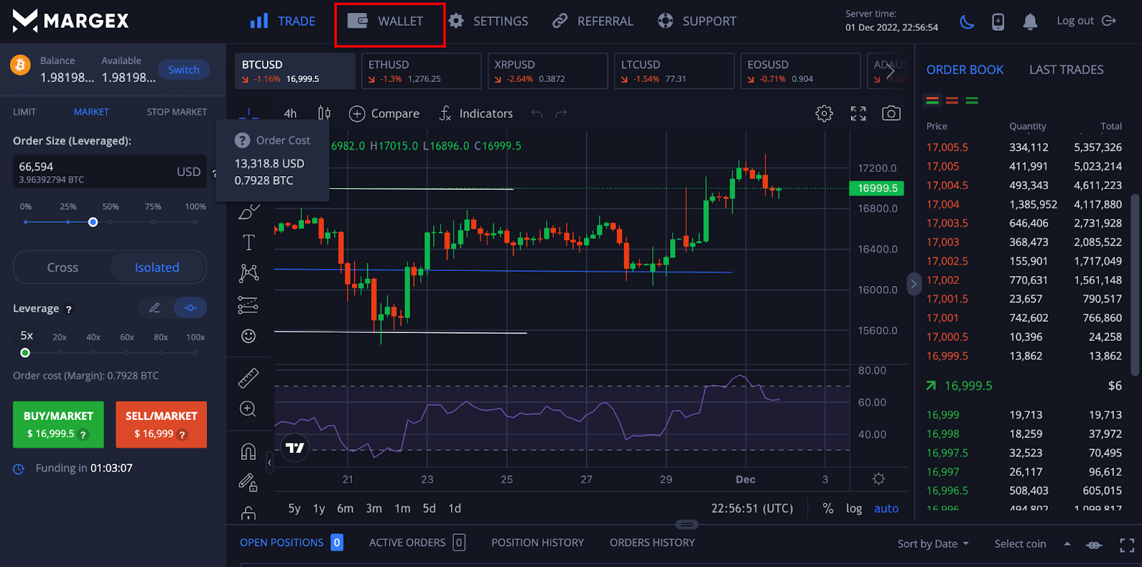After logging in to your account, click on the wallet to enable you to fund your account, as this will allow you to try using cross and isolated-margin trading.