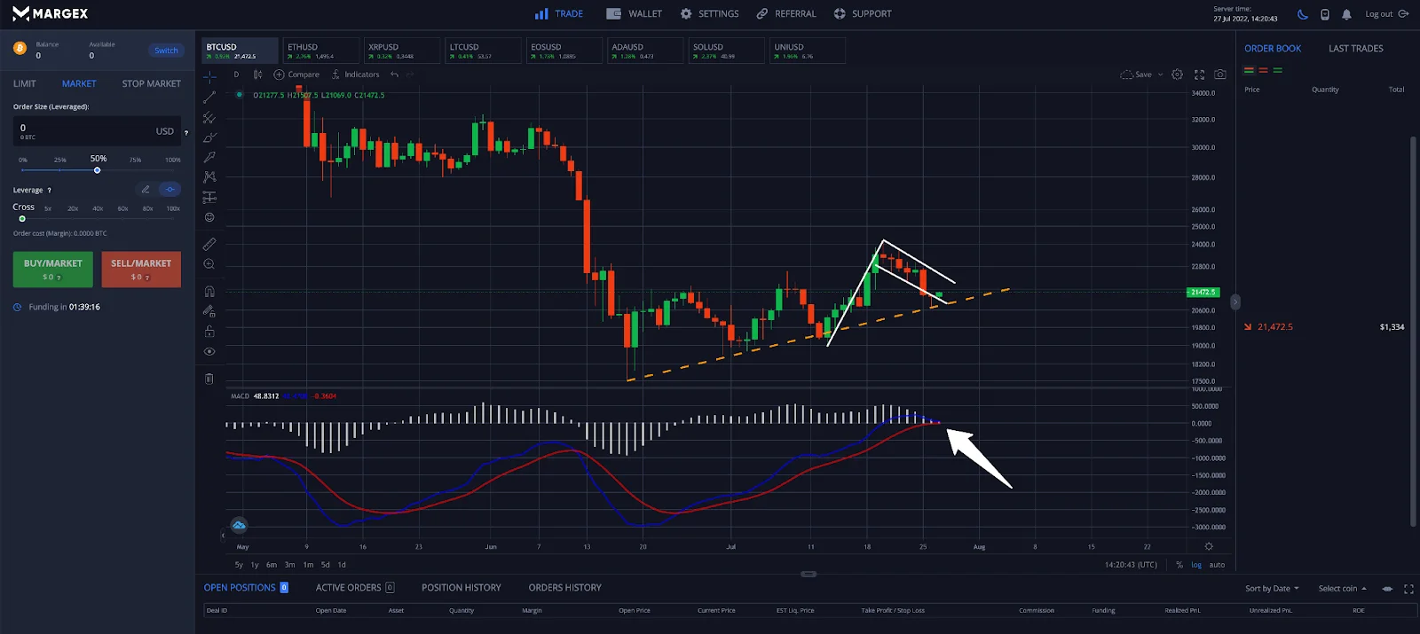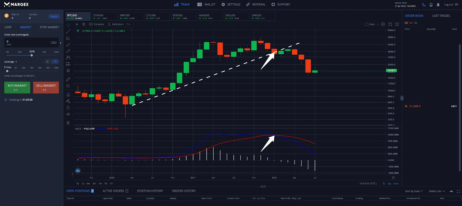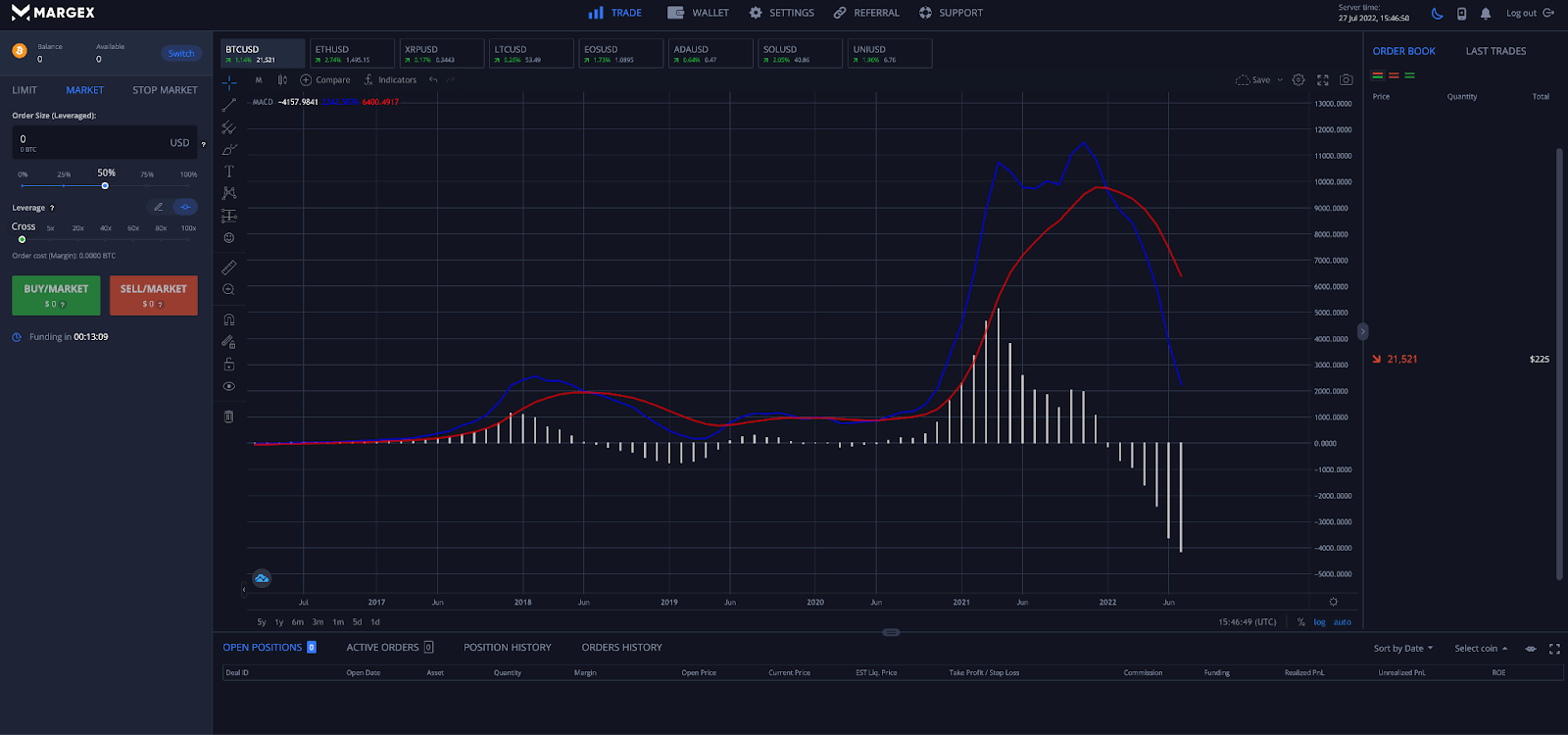 The Margex trading platform offers built-in technical analysis tools that the pros rely on, like the RSI, Ichimoku, Bollinger Bands, Fibonacci tools, and the MACD. Here is a step-by-step guide on how to use the MACD to trade crypto with Margex.