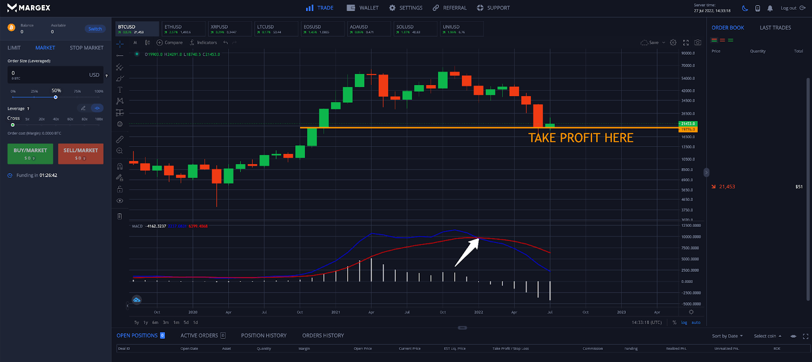Step 3 – Place a stop loss order above the candle where the crossover occurs when the MACD crosses bearish. BTC dropped another 50% from where the sell order was placed and the stop loss was never triggered.