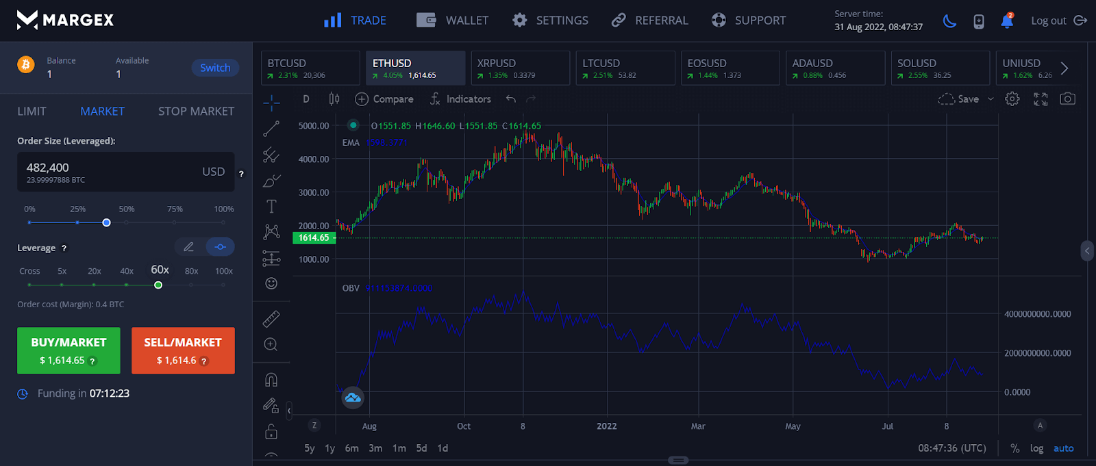 Margex is an easy to use crypto trading platform that offers a trader a suite of useful technical trading tools, as well as a high leverage option of up to 100x to help him maximise the potential of his trades. The OBV indicator is one such technical tool that Margex lets its customers use for free.